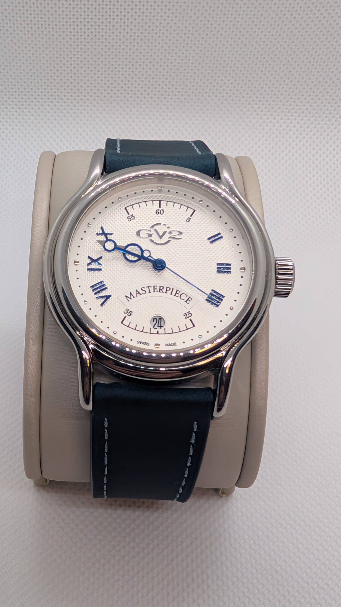• Dial: Silvered with blue markers, date at 6 o’clock.