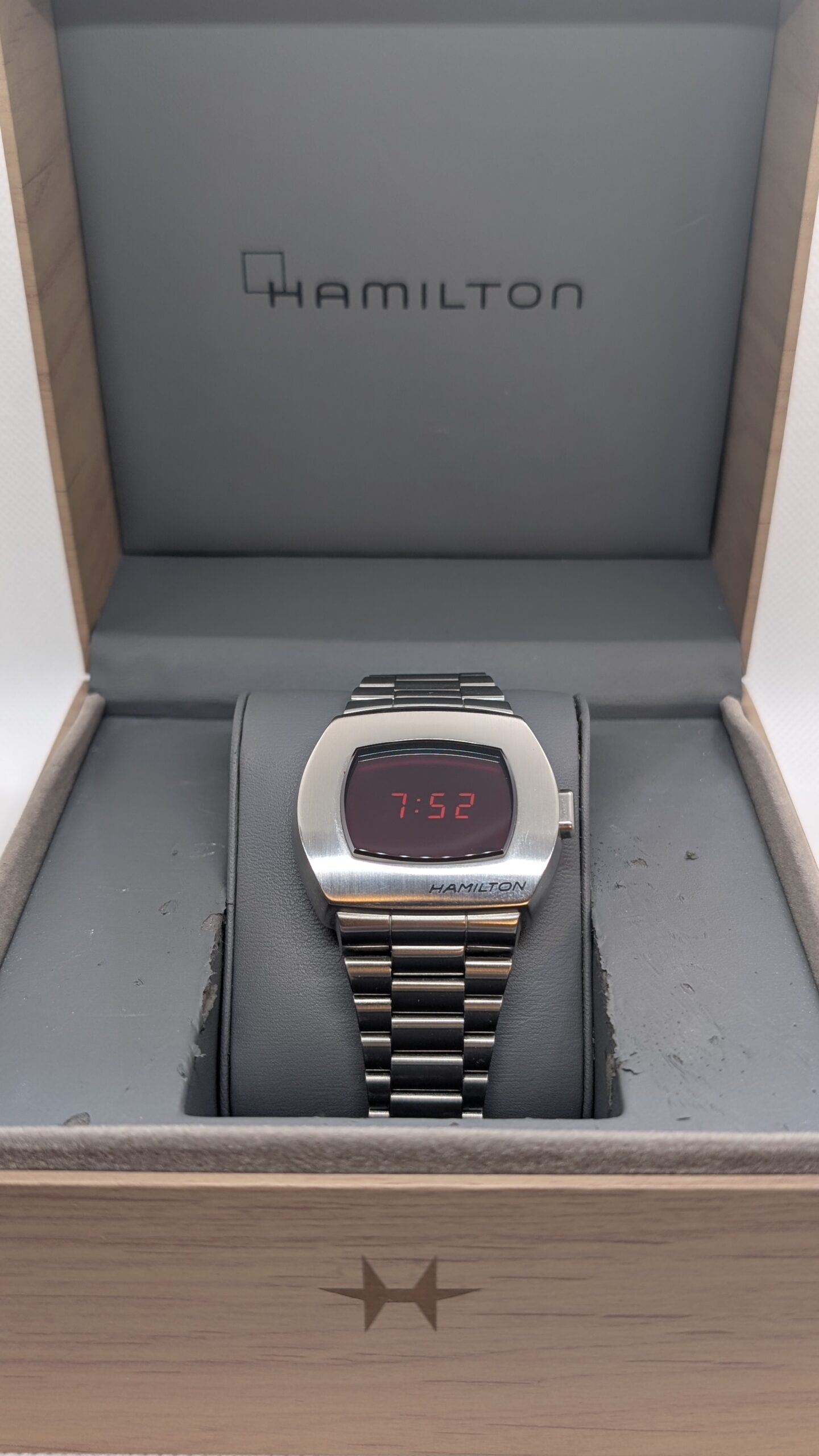 • Design: Retro-futuristic, inspired by the first digital watch, the Hamilton Pulsar.